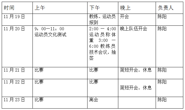 一、参加人数 女子:11男子:11 共:22二、时间、地点 时间:2021年11月20—11月23日 地点:襄阳 三:目标任务 4—5块金牌 四、赛前主要训练计划 赛前训练分为两个阶段: 第一阶段:5月1日——7月1日 主要内容: 王湘香:加强步伐的移动能力、强化击头技术和连续得分的能力,注意伤病的预防。 王岱兰:连续击头意识的强化,踢击连续能力、低、高的转换。解决步伐不够灵活,连续过程中腿踢的过低。 付宇乐:技术动作的细节规范化,解决踢击完意识上的放松行为。加强高位技术和柔韧,强化转身技术和击头技术,加强硬朗的对抗作风。 彭舒芸:加强自信心,强化作风硬朗,敢打敢拼的精神。连续技术的转换能力。 周梦曦:强化身体强硬度,低高转换能力,手臂格挡能力。 第二阶段:7月1日——10月20日 主要内容: 1、进入赛前调整期 2、鼓励队员、强化心里承受能力,增强自信心。 3、注意防伤、防病、提前预防。 4、多与运动员交流,及时掌握他们的心里动态,发现问题及时解决。 五、体重监控 目前队员还有佘天赐、张晓宣、王彦彬3人有体重问题。 六、赛区训练、比赛安排