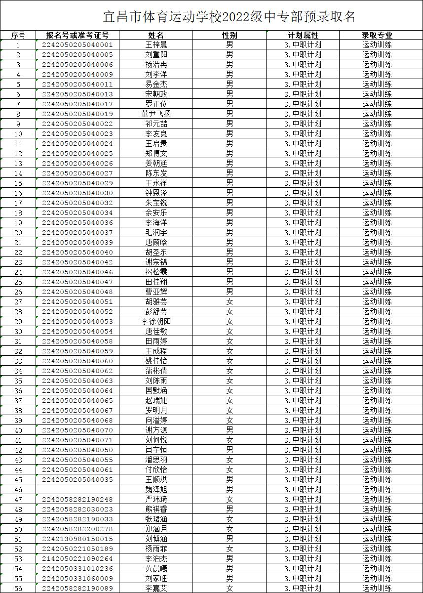 宜昌市体育运动学校2022级中专部预录取名单