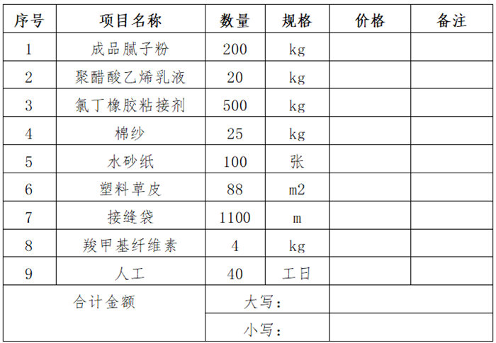 因学校五人制1号足球场草坪接缝出现多处裂痕,存在重大安全隐患,为了保障运动员训练安全,经学校2024年3月26日集体研究讨论通过,对五人制1号足球场草坪进行整体维修,现进行询价,欢迎符合资格条件的供应商前来参加。 一、采购项目名称:宜昌市体育运动学校五人制1号足球场草坪维修项目 二、采购预算价:42000 元(大写:肆万贰仟元整) 三、项目内容、时间及要求: 1.工期:签订合同后7天内必须完成全部工程量,遇雨顺延。 2. 采购需求: ①本次维修采用草坪整体揭开,重新铺装的方式,铺装面积约980平米。 ②拆除已经破损的草坪,更换为新草坪,面积约88平米。 ③该项目质保期最低不少于3年。 四、供应商资格要求: 1、报价单位应满足以下规定,即: ①供应商应具备《政府采购法》第二十二条规定的条件; ②供应商须具有有效的营业执照,营业执照有本项目相关的经营范围; ③供应商须为国内注册的企业,具有独立法人(或负责人)资格。 ④参加政府采购活动前三年内,在经营活动中没有重大违法记录。 ⑤法律、行政法规规定的其他条件。 2、单位负责人为同一人或者存在直接控股、管理关系的不同供应商,不得参加本项目同一合同项下的政府采购活动。 3、为本采购项目提供整体设计、规范编制或者项目管理、监理、检测等服务的,不得再参加本项目的其他招标采购活动。 4、未被列入失信被执行人、重大税收违法案件当事人名单,未被列入政府采购严重违法失信行为记录名单。 5、落实政府采购政策需满足的资格要求:本项目专门面向中小微企业采购。 6、本项目不接受联合体。 五、公示时间:2024年3月28日至2024年4月1日。 六、获取采购文件:自行在本公告底部下载报价单 七、报价文件递交截止时间:2024年4月2日9时00分(2024年4月2日8时30分开始接收报价文件)。 八、报价文件递交地点:宜昌市体育场路17号宜昌市体育运动学校 九、询价议定时间:2024年4月2日9时00分,询价结束,询价小组进行评标。 十、询价地点:宜昌市体育场路17号宜昌市体育运动学校会议室。 十一、结果公告:议定结束后,公示议定结果,议定结果在我校网站公示1个工作日。 十二、采购人:宜昌市体育运动学校,联系人:赵老师,电话:0717-6923613。 宜昌市体育运动学校五人制1号足球场草坪维修项目报价单