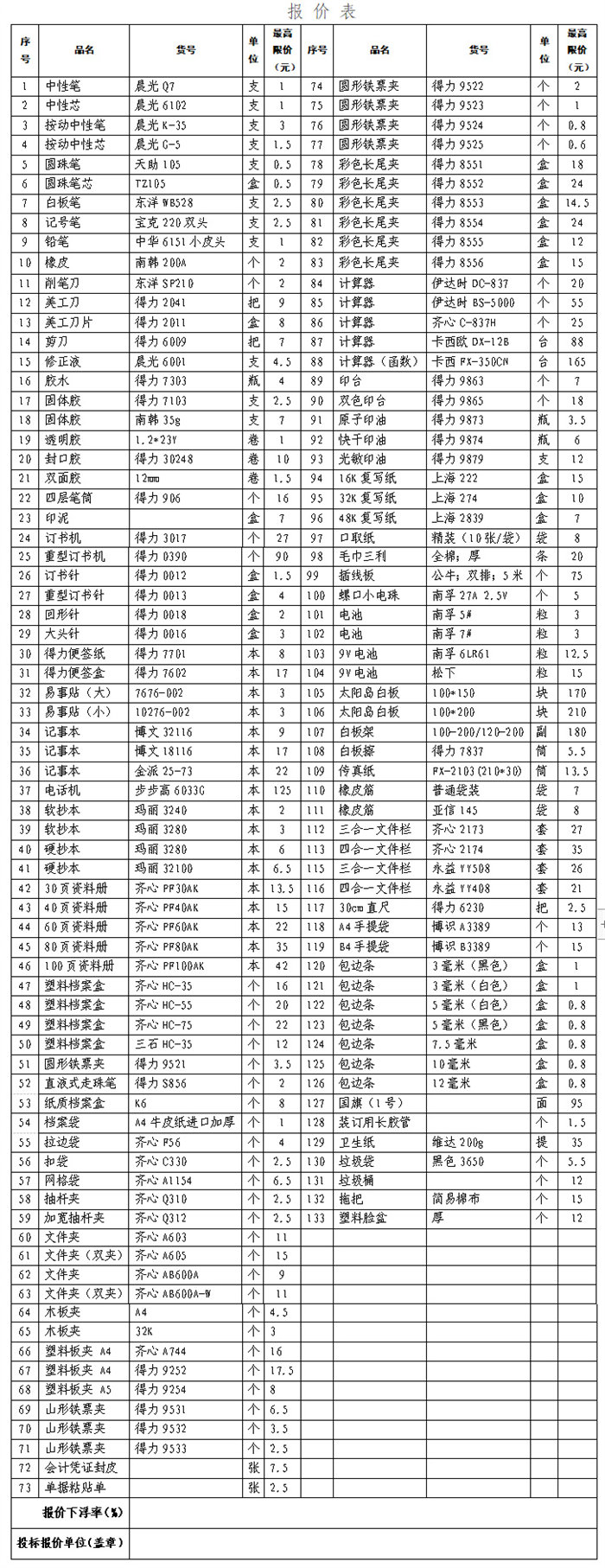 三、供应商资格 1.供应商应具备《中华人民共和国政府采购法》第二十二条规定的条件; 2.供应商须具有有效的营业执照,营业执照有本项目相关的经营范围; 3.供应商须为国内注册的企业,具有独立法人(或负责人)资格; 4.供应商在“信用中国”网站(www.creditchina.gov.cn)中未被列入失信被执行人、重大税收违法案件当事人、政府采购严重违法失信行为记录名单。 四、报价文件格式及相关要求 1.报价文件包括:1)法定代表人证明书;2)法人代表授权委托书;3)营业执照复印件,4)报价表;5)售后服务承诺;6)报价人认为需要的其他资料。报价文件每页须加盖公章。 2.报价文件需单独密封。 3.本项目只报各项单价统一下浮比例。 注:结算单价=单价最高限价X(1-中标下浮率) 五、公示时间 2024年5月7日至2024年5月10日 六、报价文件递交截止时间 报价文件递交截止时间:2024年5月11日9时30分(2024年5月11日9时00分开始接收报价文件)。逾期递交报价文件的不予受理。 七、发布媒体 宜昌市体育运动学校官网上发布。 八、报价文件送达地点 1.地址:宜昌市体校办公室(宜昌市体育场路17号) 2.联系人:彭老师 3.联系电话:0717-6923605 15807203872 九、询价时间、地点 询价时间:2024年5月11日10:00。询价结果在宜昌市体育运动学校官网上公告。 地点:宜昌市体育运动学校(宜昌市体育场路17号) |