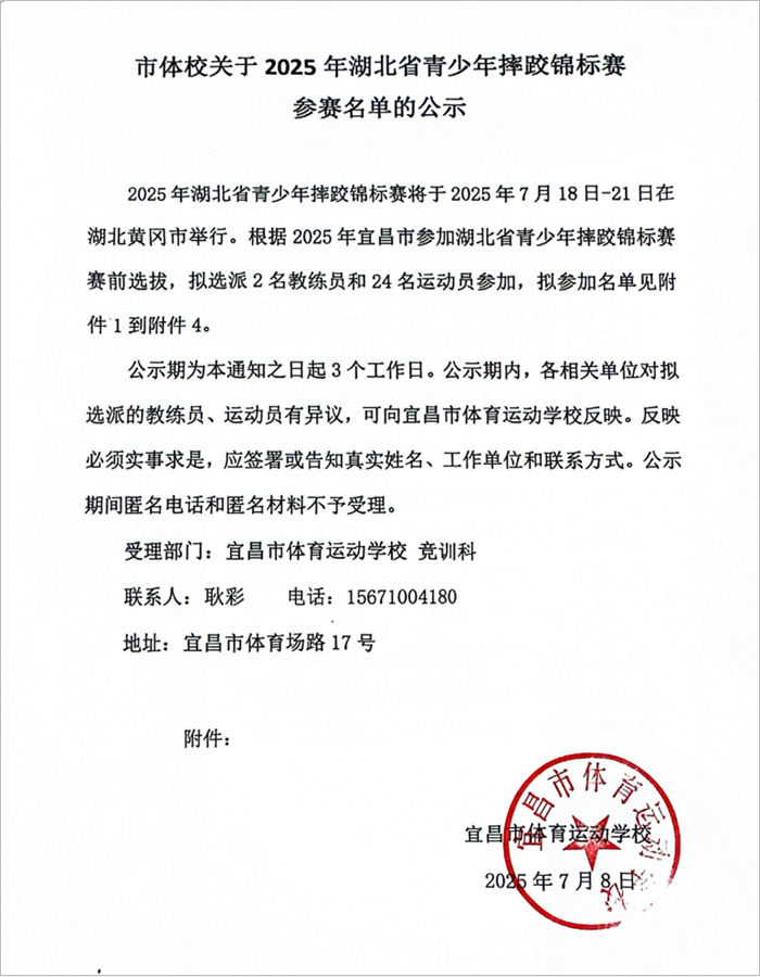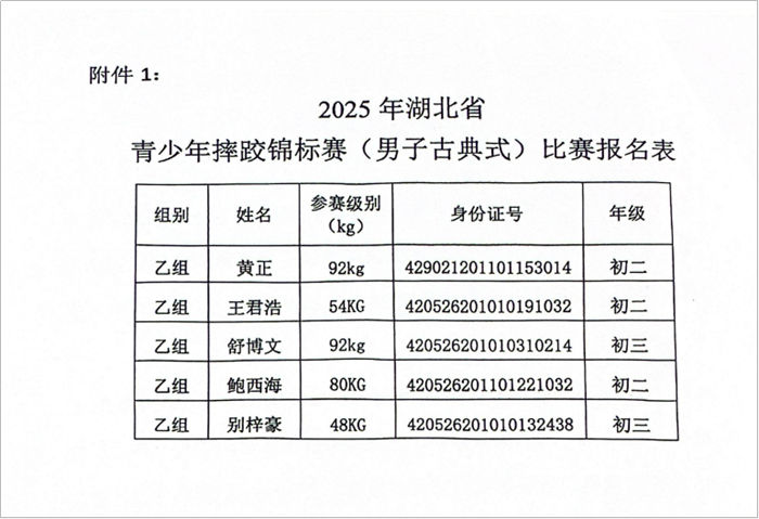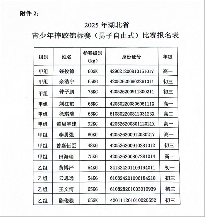 市体校关于 2025年湖北省青少年摔跤锦标赛参赛名单的公示