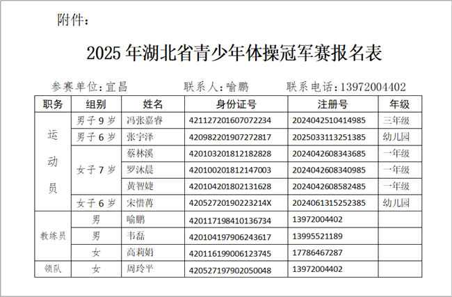 | 市体校关于2025年湖北省青少年体操冠军赛的参赛名单的公示 |