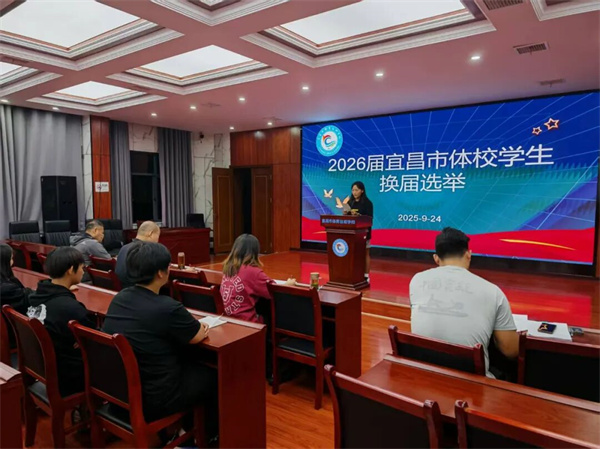 2025年9月24日晚20:00,宜昌市体育运动学校的阶梯教室迎来了一个充满希望与活力的时刻——2026届学生会成员换届选举。此次选举由我校副校长张柱国、学生科科长赵丹、学生科成员肖锋和资深教练浦少刚担任评委团,学生科肖锋老师担任活动主持