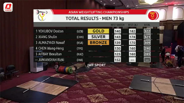 北京时间10月11日晚,2022年亚洲举重锦标赛继续在巴林进行,男子73公斤级决赛的较量中,中国选手向术林抓举143公斤、挺举178公斤、总成绩321公斤,收获抓举、挺举以及总成绩三枚银牌,总成绩金牌归属乌兹别克斯坦选手,成绩为322公斤。