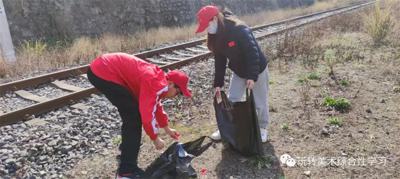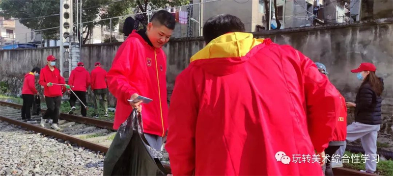 体校学生身着红色校服,在胜利四路铁路沿线捡拾各类垃圾,不放过任何一个角落,为宜昌的环境综合整治助力。