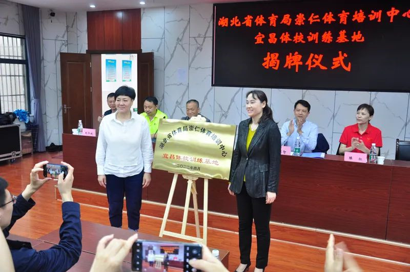 寻芳漫步怜今日,最美人间四月天。2022年4月27日上午9点,宜昌体校隆重举⾏省体育局崇仁体育培训中心“宜昌体校训练基地”揭牌仪式,此次活动由市体校副校长姚金玲主持,崇仁体育培训中心副主任石晓铭、崇仁体育培训中心少儿体校校长陈红、副校长刘华斌、校长助理袁梓轩、体操项目组组长张艺、市文化和旅游局副局长李生智、省十六运会宜昌筹委会专家黄小铭 、市文化和旅游局竞技科科长刘争进、市体校校长王燕珍、副校长张柱国等共同出席本次揭牌仪式,市体校游泳教练及运动员代表参加了本次揭牌仪式。