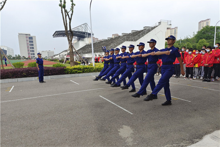 接着,队长带领师生来观看消防员战士们日常队列训练。在教官的指令下,他们迈着整齐划一的步伐,眼神坚定且自信,动作迅速且刚毅。