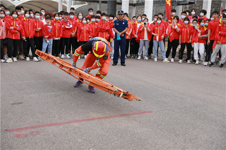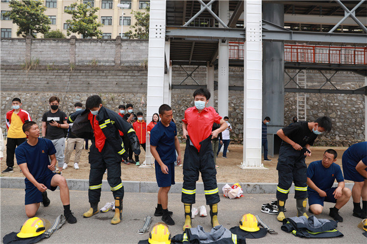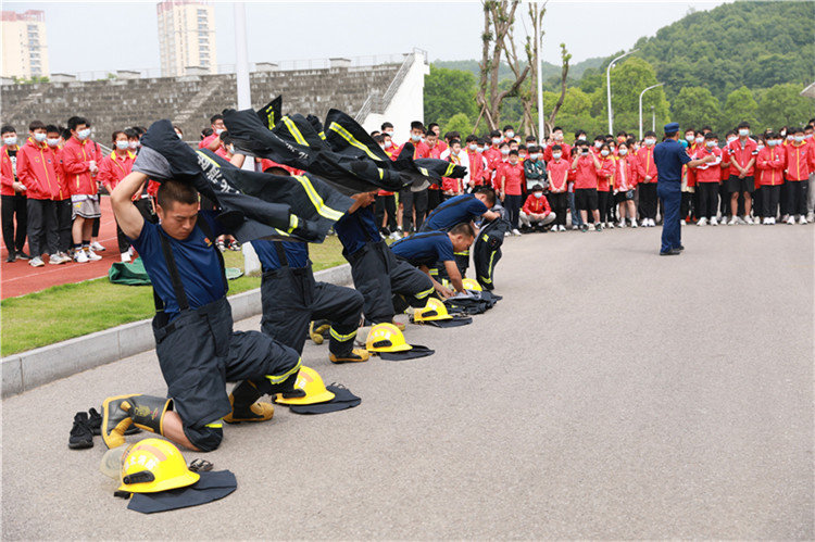 跟随队长的步伐,我们观看了消防员原地着消防救生服的表演。在消防员眼里,时间就是金钱,他们需要通过不断地训练用最短的时间穿好战斗服,确保在20秒内穿戴完成。台上一分钟,台下十年功。我们的学生也看得热血沸腾,跃跃欲试。在教官地指导下,学生们试穿了救生服,并进行了原地着装比赛。