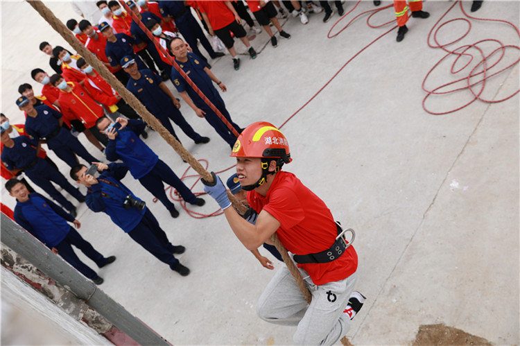 市体校学生在教官指导下进行爬绳上四楼演练
