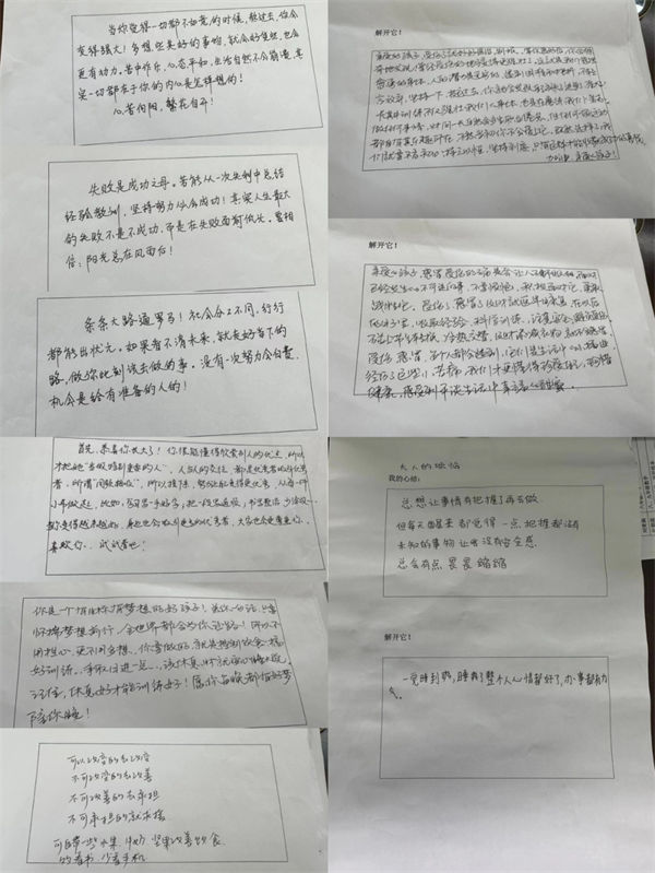 我们同时采用调查问卷的形式,让学生写下自己的心结,老师阅读学生的心声并帮助答疑解惑,帮助学生从“山重水尽疑无路”的苦闷转向“柳暗花明又一村”的明媚心境。