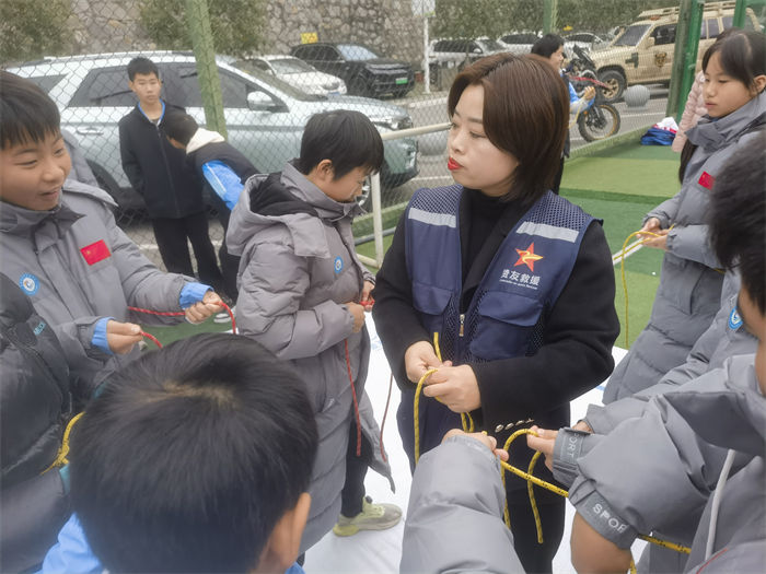 面对紧急情况,一根绳子可能就是生的希望。逃生绳结培训老师殷红梅,以其娴熟的手法,现场教授了多种实用的逃生绳结打法,如双套结、普鲁士结等,不仅强化了同学们的动手能力,更提升了他们在复杂环境下的生存自救能力。