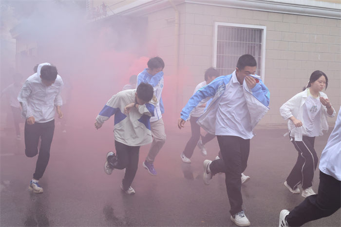 随着校园内消防警报声骤然响起,模拟学生公寓突发“火情”,浓烟迅速蔓延。学校立即启动消防应急预案,应急通道开启,各班级教师迅速组织学生用湿毛巾捂住口鼻,弯腰沿疏散通道有序撤离至操场安全区域。副校长张柱国和消防士官对疏散过程进行了点评。