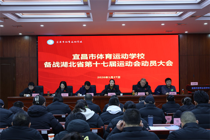 2026年1月27日,宜昌市体育运动学校召开备战湖北省第十七届运动会动员大会。市文化和旅游局党组成员、副局长李生智出席大会,学校领导班子及全体教职工参会。会议以“统一思想、凝聚共识、激昂斗志”为主题,全面部署备战任务,吹响决战省运会的冲锋号。 会议首先由副校长…